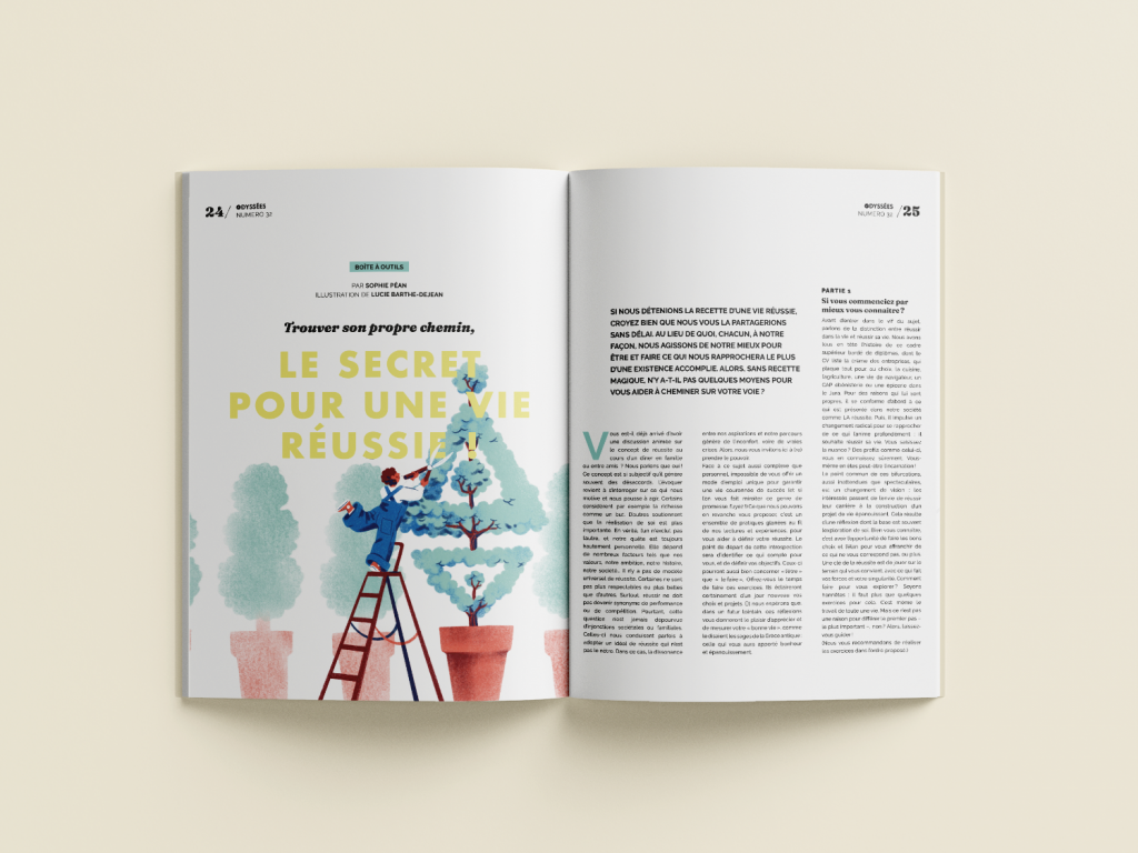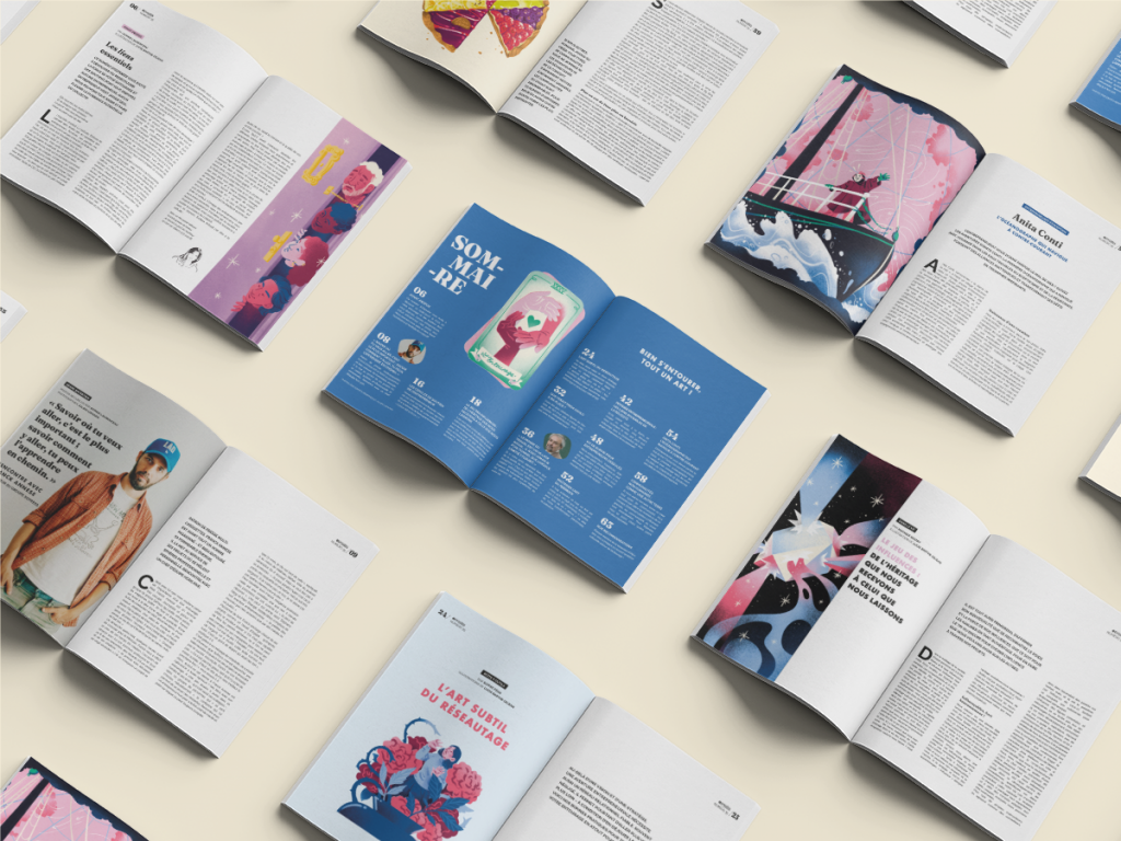 Dans ce magazine destiné aux entrepreneur.es, j’ai illustré les sommaires et avants-propos thématiques ainsi que de nombreux portraits et articles philo, éco, exercices pratiques et rubriques humoristiques.